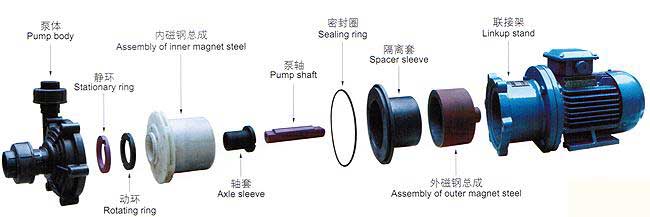 磁力泵以静密封取代动密封,使泵的过流部件处于完全密封状态,彻底解决了其它泵的机械密封无法避免的跑,冒,滴之蔽病,磁力泵选用耐腐蚀,钢玉陶磁,增强聚丙稀作为制造材料,因此它具有良好的抗腐蚀性能,并可以使实输送介质免受污染。